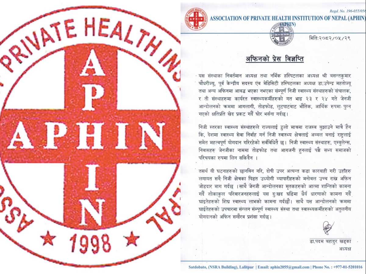 अफिनले संस्थाका निवर्तमान अध्यक्ष तथा नर्भिक हस्पिटलका अध्यक्ष बसन्तकुमार चौधरी, पूर्व केन्द्रीय सदस्य एंव मेडिसिटी हस्पिटलका अध्यक्ष डा. उपेन्द्र महता तथा अन्य अफिनमा आबद्ध भएका नभएका संम्पूर्ण निजी स्वास्थ्य संस्थाहरुको संचालक र ती संस्थाहरूमा कार्यरत स्वास्थ्यकर्मीहरूको गत भाद्र २३ र २४ गते जेनजी आन्दोलनको क्रममा आगलागी, तोडफोड, लुटपाटबाट भौतिक, आर्थिक रुपमा पुग्न गएको क्षतिप्रति खेद प्रकट गर्दै भर्सना गरेको छ ।