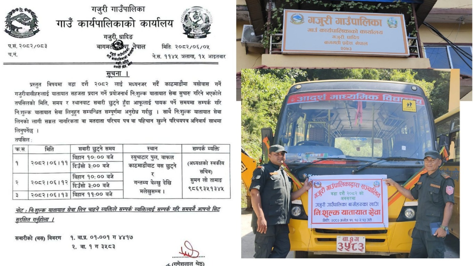 काठमाडाैँ । धादिङकाे गजुरी गाउँपालिकाले आगामी दसैँ २०८२ लाई मध्यनजर गर्दै काठमाडौँमा बसोबास गर्ने गजुरीवासीका लागि निःशुल्क यातायात सेवा सञ्चालन गर्ने भएको छ।