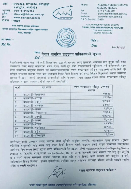 प्राधिकरणले नेपाल सरकारद्वारा तोकिएका विभिन्न ट्रनक सेक्टरहरूको उच्चतम भाडादर सार्वजनिक गर्दै कुनै पनि कम्पनी वा आधिकारिक टिकट विक्रेता तथा ट्राभल एजेन्सीले यसभन्दा बढी रकम असुल गर्ने कार्य गैरकानुनी हुने चेतावनी दिएको छ । उदाहरणका लागि काठमाडौँ–विराटनगरको अधिकतम भाडा ९ हजार ७८५ रुपैयाँ, काठमाडौँ–पोखराको ६हजार ६३५ रुपैयाँ, काठमाडौँ–नेपालगञ्जको १३ हजार १०३ रुपैयाँ र काठमाडौँ–धनगढीको १७ हजार ५७९ रुपैयाँ तोकिएको छ ।