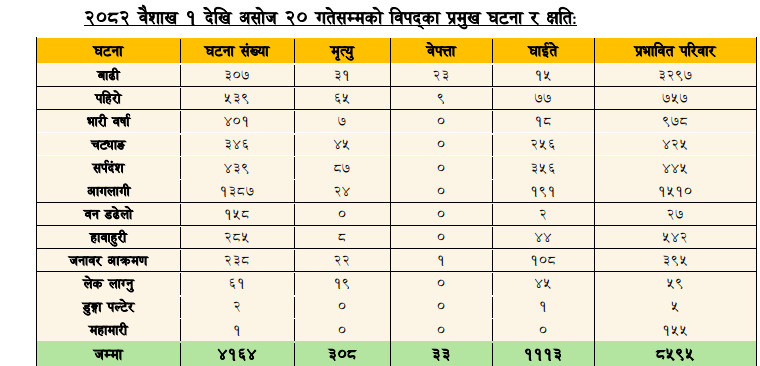 २०८२ को वैशाख १ देखि असोज २० सम्म विपद्बाट ३ सय बढीको मृत्यु, ३३ बेपत्ता, ८ हजार बढी परिवार प्रभावित