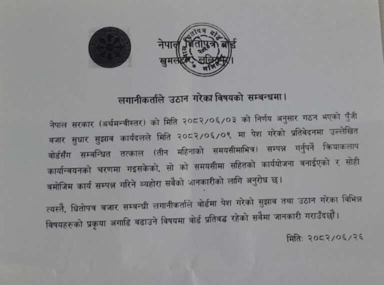 बोर्डले विज्ञप्ति जारी गर्दै पुँजी बजार सुधार सुझाव कार्यदलले पेश गरेको प्रतिवेदनमा उल्लेखित बोर्डसँग सम्बन्धित तीन महिनाभित्र गर्नुपर्ने काम कार्यान्वयनको चरणमा गइसकेको जानकारी समेत गराएको छ ।