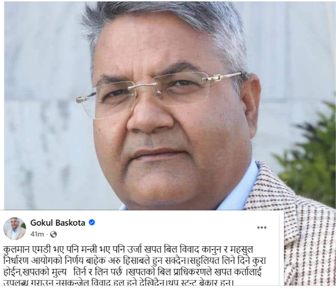 बाँस्कोटाले भनेका छन्,“कुलमान एमडी भए पनि मन्त्री भए पनि ऊर्जा खपत बिल विवाद कानुन र महसुल निर्धारण आयोगको निर्णय बाहेक अरु हिसाबले हुन सक्दैन । सहुलियत लिने दिने कुरा होईन,खपतको मुल्य तिर्न र लिन पर्छ । खपतको बिल प्राधिकरणले खपतकर्तालाई उपलब्ध गराउन नसकुन्जेल विवाद हल हुने देखिदैन । थप स्टन्ट बेकार हुन् ।”