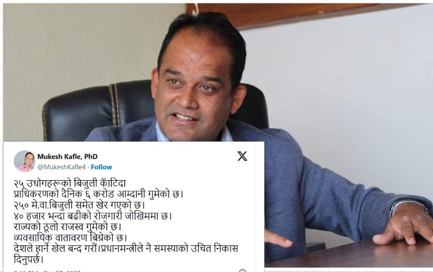 २५ उद्योगहरूको बिजुली कककाटिदा प्राधिकरणले दैनिक ६ करोड रुपैयाँ आम्दानी गुमाएको र २५० मे.वा.बिजुलीसमेत खेर गएको पूर्वकार्यकारी निर्देशक काफ्लेको भनाई छ ।