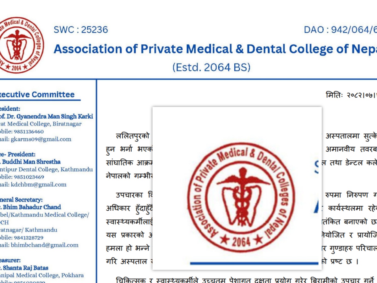 काठमाडौँ । ललितपुरको इमाडोलमा रहेको किष्ट मेडिकल कलेजमा सुत्केरी भर्नाको विषयलाई लिएर भएको आक्रमणबारे एसोसिएसन अफ प्राइभेट मेडिकल तथा डेन्टल कलेज नेपालले गम्भीर ध्यानकर्षण भएको जनाएको छ ।