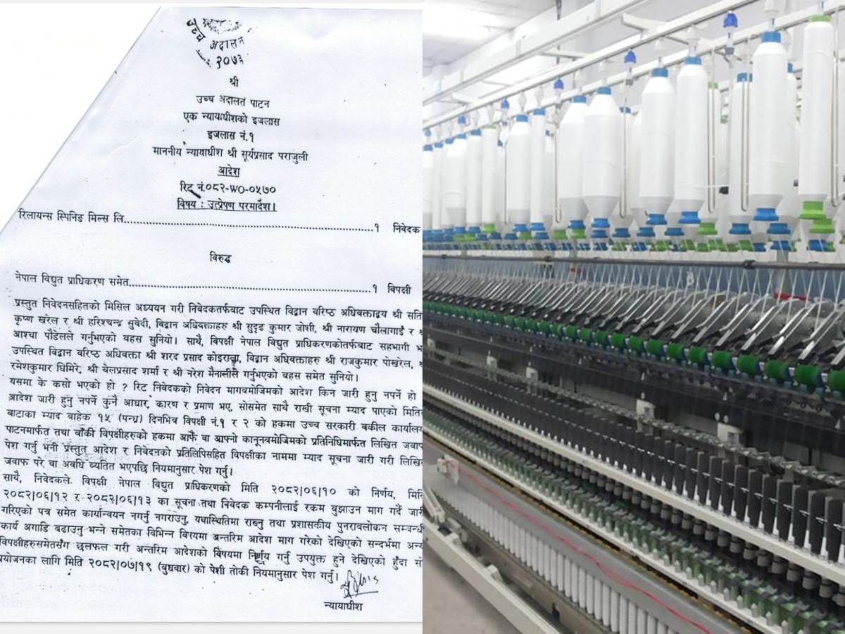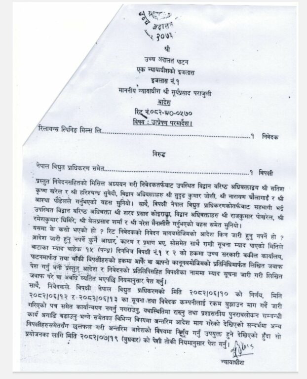 शुल्क विवादमा रिलायन्स स्पिनिङ मिल्सले अन्तरिम आदेशको माग गर्दै उच्च अदालत पाटनमा रिट दायर गरेको थियो ।
