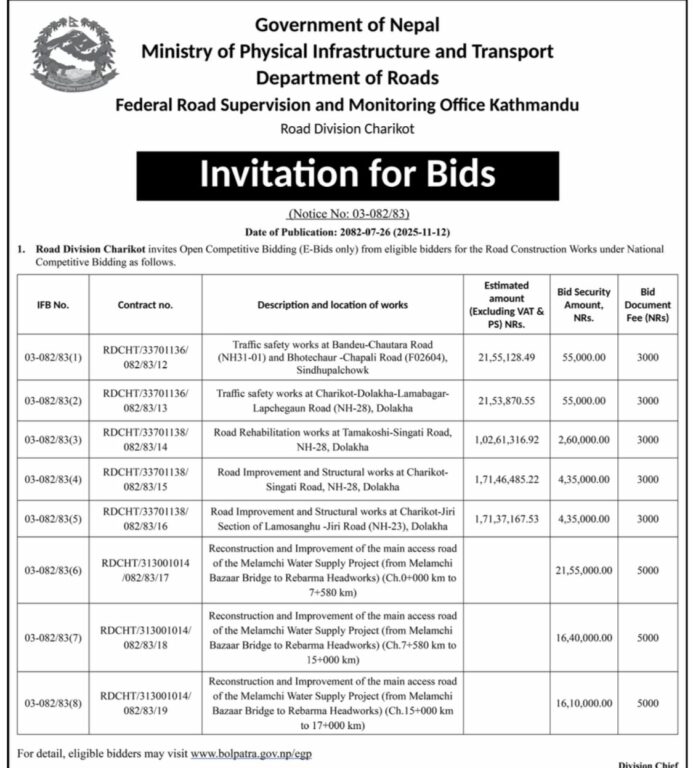ऊर्जा, जलस्रोत तथा सिँचाइ, भौतिक पूर्वाधार तथा यातायात र शहरी विकास मन्त्री कुलमान घिसिङको उपस्थितिमा मंगलबार खानेपानी मन्त्रालय र मेलम्ची खानेपानी आयोजनाका सरोकार समितिहरूबिच भएको समझदारी कार्यान्वयनका क्रममा सडक डिभिजन कार्यालय, चरिकोटले बुधबार सडक स्तरोन्नति गर्न टेण्डर आह्नान गरेको छ ।