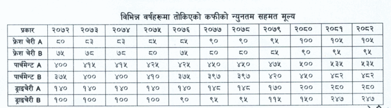 काठमाडाैँ । नेपालमा कफी उत्पादन गर्ने किसान र व्यापारीको हित सुनिश्चित गर्न कफी बोर्डले विगत ११ वर्ष (२०७२-०८२) देखि न्यूनतम सहमत मूल्य निर्धारण गर्दै आएको छ। बोर्डका अनुसार फ्रेस चेरी, पार्चमेन्ट र ड्राइ चेरी कफीका विभिन्न ग्रेडको मूल्य क्रमिक रूपमा बढ्दै आएको छ।