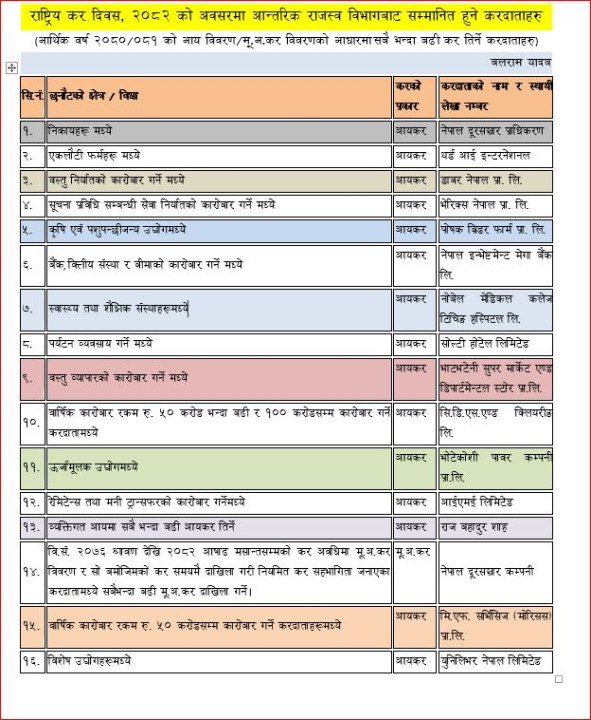 आयकरतर्फ उत्कृष्ट करदातामा नेपाल टेलिकम, युनिलिभर नेपाल, नेपाल इन्भेष्टमेण्ट मेगा बैंक, ग्रान्डी अस्पताल, होटल ह्याट लगायतका संस्था परेको छ । त्यस्तै ५० करोडभन्दा बढी कर तिर्ने तथा १०० करोडभन्दा बढी कारोबार गर्ने संस्थामध्ये डिस्टिलरी नेपाल प्रा.लि. सम्मानित भएको छ ।