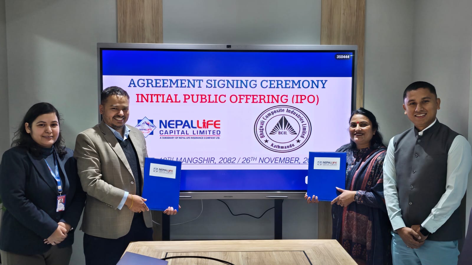 कम्पनीले नेपाल लाइफ क्यापिटललाई शेयर निष्काशन तथा बिक्री प्रबन्धकमा नियुक्त गर्दै सम्झौता पत्रमा भगवती कम्पोजिट इण्डष्ट्रिज लिमिटेडका तर्फबाट अध्यक्ष श्री दक्षिणा गैह्रे न्यौपानेज्यू तथा नेपाल लाइफ क्यपिटल लिमिटेडका तर्फबाट प्रमुख कार्यकारी अधिकृत श्री मनिष घिमिरेज्यूले हस्ताक्षर गर्नुभएको छ ।