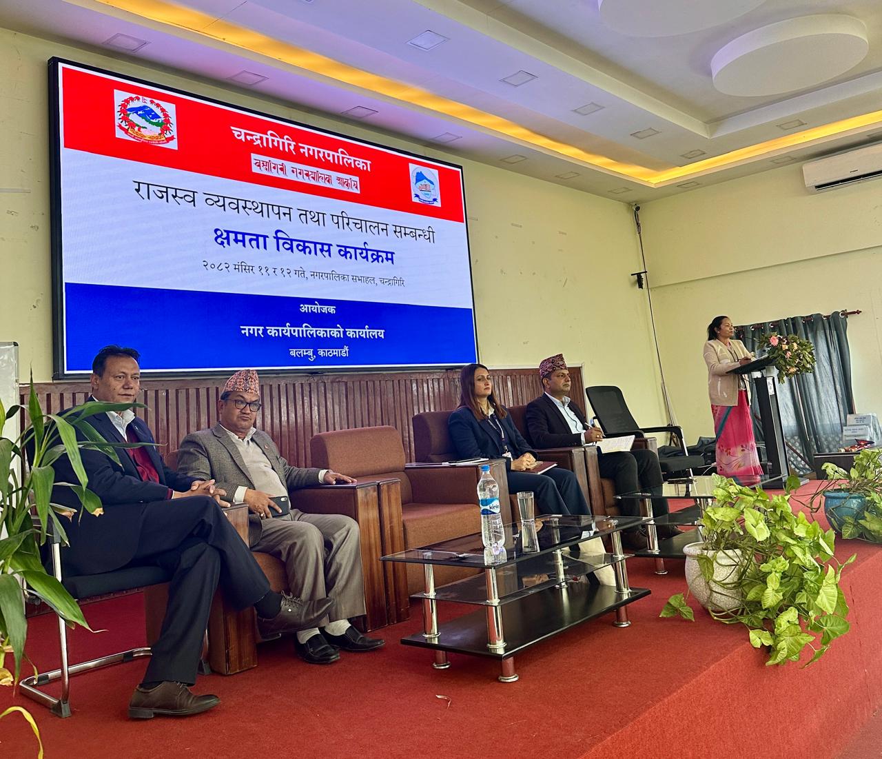 काठमाडाैँ । काठमाडाैँकाे चन्द्रागिरि नगरपालिकामा स्थानीय तहको राजस्व प्रणाली सुदृढीकरणका लागि आज (मंसिर ११ गते) देखि दुई दिने क्षमता अभिवृद्धि प्रशिक्षण सुरू भएको छ।
