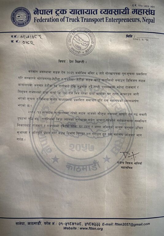 हेटौंडा सडक विस्तार छिटो अघि बढाउन ट्रक व्यवसायी महासंघको जोड, कानुनअनुसार मुआब्जा उपलब्ध गराउन माग