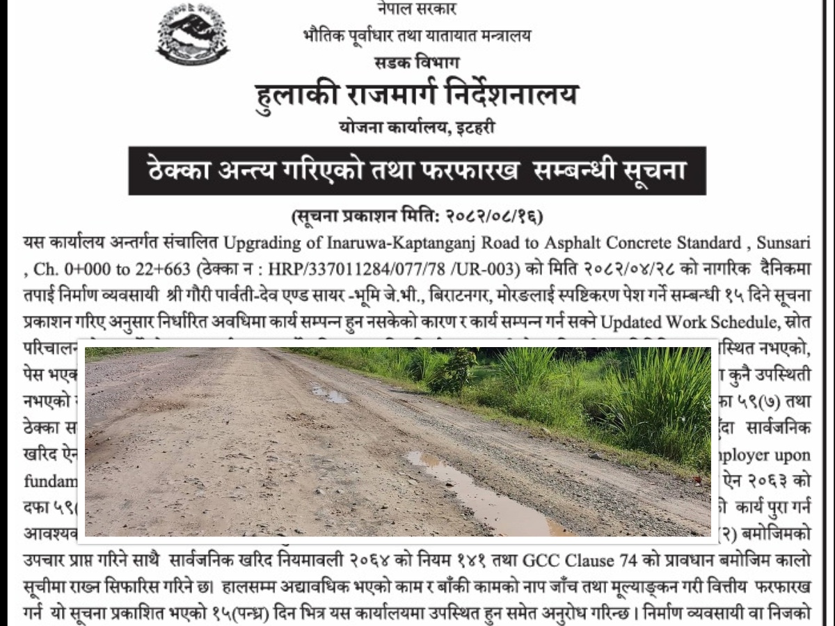 सडक विभाग मातहतको हुलाकी राजमार्ग निर्देशनालयअन्तर्गत योजना कार्यालय इटहरीले आज सडक निर्माणका लागि गौरीपार्वती-देव एन्ड सायर-भूमि संयुक्त उपक्रम (जेभी), विराटनगरसँगको ठेक्का सम्झौता अन्त्य गरिएको सार्वजनिक सूचना जारी गरेको छ ।