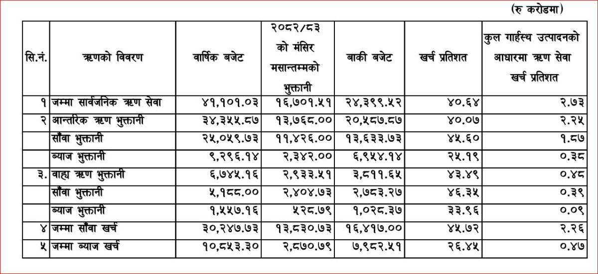 यस्तै, चालु आर्थिक वर्ष २०८२/८३ मा ऋण सेवा खर्चमा ४ खर्ब ११ अर्ब १ करोड बजेट विनियोजन भएकोमा मंसिर मसान्तसम्म १ खर्ब ६७ अर्ब १ करोड भुक्तानी भएको छ ।
