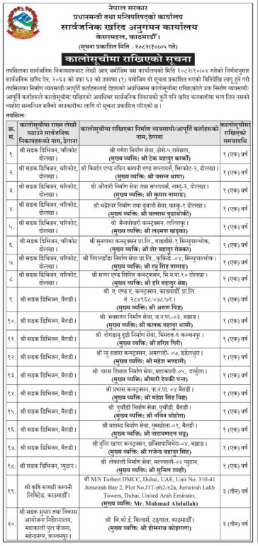 प्रधानमन्त्री तथा मन्त्रिपरिषद्को कार्यालयअन्तर्गतको उक्त कार्यालयले विभिन्न सार्वजनिक निकायको सिफारिसका आधारमा सार्वजनिक खरिद ऐन, २०६३ को दफा ६३ बमोजिम १८ ओटा कम्पनीलाई एक वर्षसम्म र २ ओटा कम्पनीलाई ३ वर्षसम्म कालोसूचिमा राख्ने निर्णय गरेको छ ।