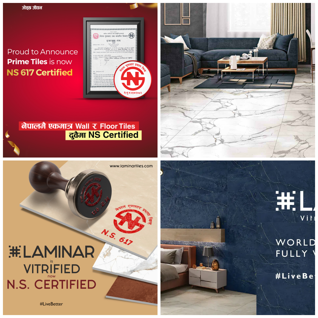 यसैगरी, लेमिनार टायल्सले पनि एनएस प्रमाणपत्र प्राप्त गर्दै नेपाली टायल उद्योगमा अर्को उपलब्धि थपेको छ । लुम्बिनी सेरामिक्स लिमिटेडद्वारा उत्पादन हुँदै आएको लेमिनार टायल्सले ‘ग्रुप बी आइए पूर्ण भिट्रिफाइड टायल्स’ श्रेणीअन्तर्गत एनएस प्रमाणीकरण प्राप्त गरेको हो ।