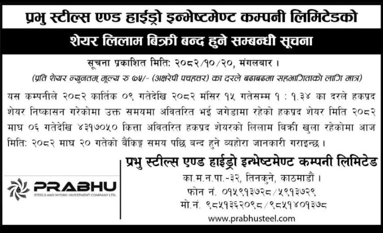 काठमाडौँ । प्रभु स्टील्स एन्ड हाइड्रो इन्भेष्टमेन्ट कम्पनी लिमिटेडको सेयर लिलाम बिक्री आजसम्म मात्रै हुने भएकाे छ ।