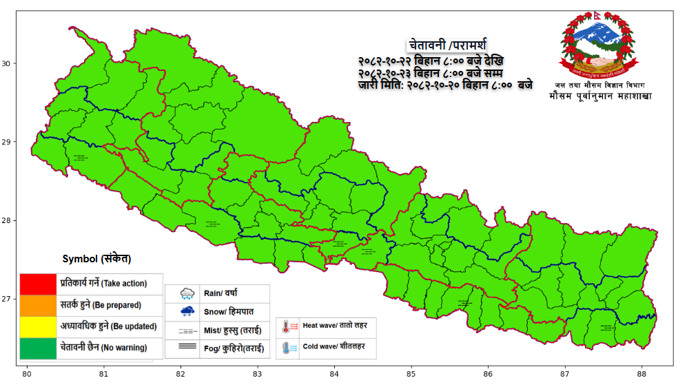 यसैगरी बिहीबार दिउँसो तराई भू–भागका धेरै स्थानमा हुस्सु तथा कुहिरो लाग्नेछ भने पहाडी र हिमाली भू–भागमा मौसम मुख्यतया सफा रहनेछ।