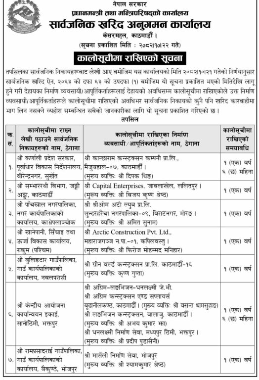 कालोसूचीमा पर्नेहरूमा कान्छाराम कन्स्ट्रक्सन कम्पनी प्रा. लि., श्रीओम अटो ल्युब प्रा. लि., आर्कटिक कन्स्ट्रक्सन प्रा. लि., ग्रिन वल्र्ड कन्स्ट्रक्सन प्रा. लि, अग्रिम–लङभिजन–धनलक्ष्मी जे.भी., मार्सेली निर्माण सेवा लगायत छन् ।
