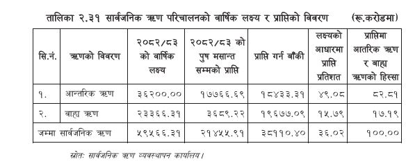आन्तरिक ऋणतर्फ लक्ष्यको ४९ दशमलव ०८ प्रतिशत प्रगति भएको छ भने बाह्य ऋण परिचालन १५ दशमलव ७९ प्रतिशतमा सीमित रहेको छ । कूल प्राप्त सार्वजनिक ऋणमध्ये आन्तरिक ऋणको हिस्सा २२ दशमलव ८१ प्रतिशत र बाह्य ऋणको हिस्सा १७ दशमलव १९ प्रतिशत रहेको छ ।