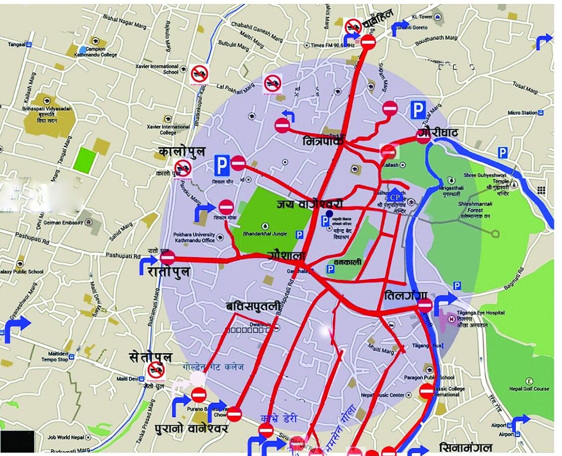 सामान्य अवस्थामा चाबहिल, गौशाला र तिलगंगा क्षेत्रमा सवारी सञ्चालन यथावत रहनेछ। तर भीड अत्यधिक बढेमा आवश्यकतानुसार डाइभर्सन गरी वैकल्पिक मार्गबाट सवारी सञ्चालन गरिनेछ।