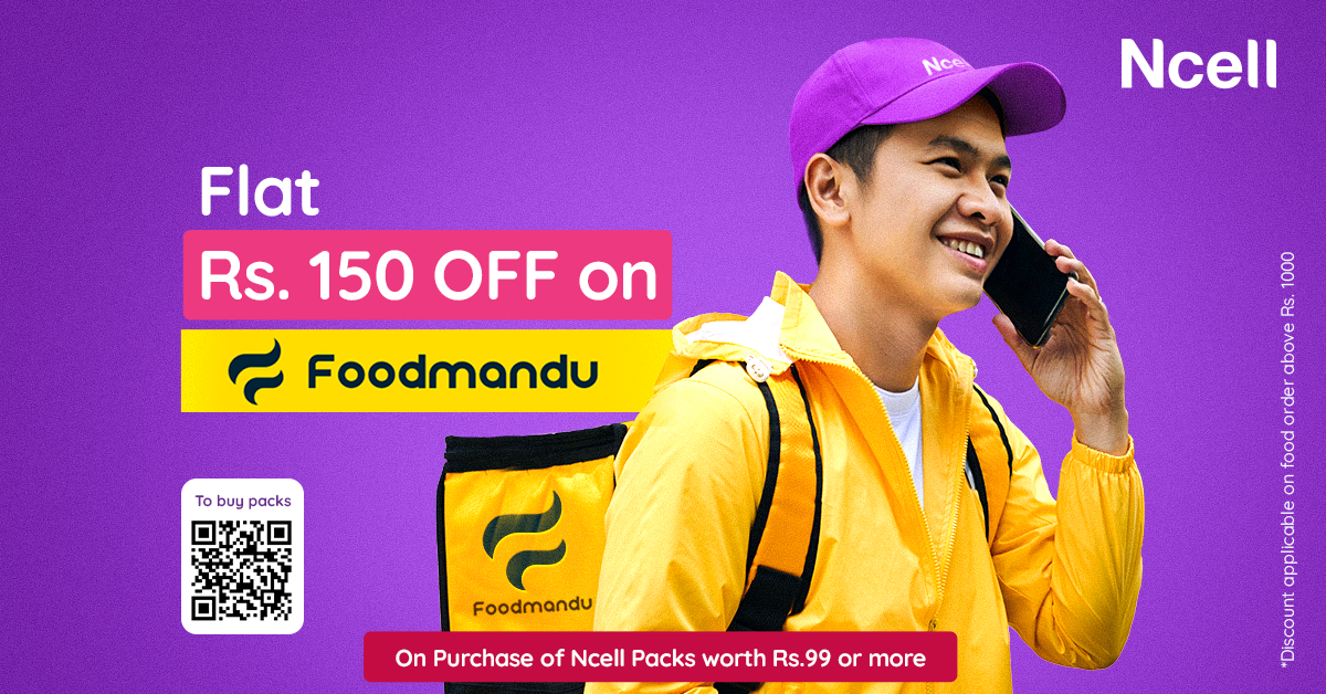 काठमाडौँ । एनसेलले फुडमान्डुसँग साझेदारी गर्दै नयाँ अफर सुरु गरेको छ । साझेदारीअनुसार एनसेलका ग्राहकहरूले फुडमान्डुमा खानाका परिकार अर्डर गर्दा १५० रुपैयाँ छुट पाउनेछन् ।