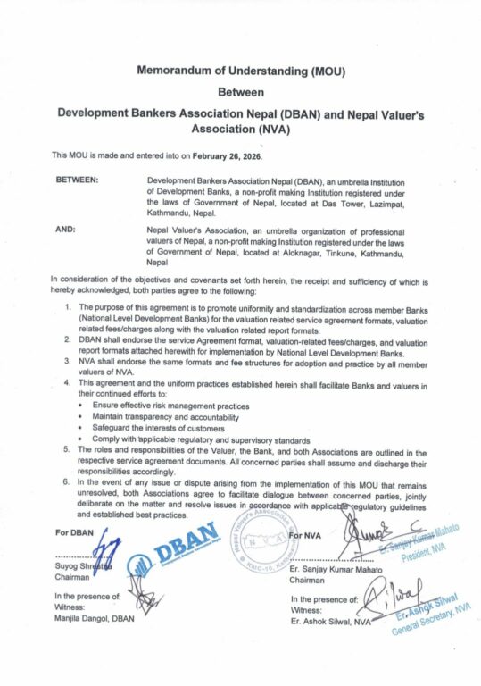 काठमाडौँ । नेपाल भ्यालुयर्स एशोसिएशन (एनभिए) र डेभलपमेन्ट बैंकर्स एशोसिएसन नेपाल (डिबान) बिच सम्पत्ति मूल्यांकनसम्बन्धी सेवा तथा शुल्कलाई एकरूप बनाउने सम्झौता भएको छ ।