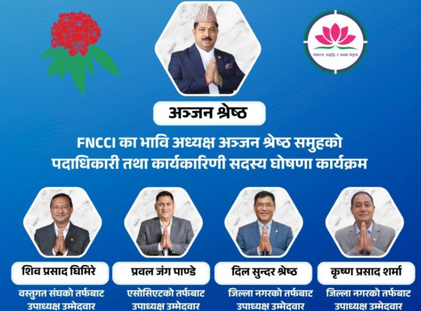 काठमाडौँ । उद्योग वाणिज्य महासङ्घको आगामी नेतृत्वका लागि भावी अध्यक्ष अञ्जन श्रेष्ठ समूहले आज प्यानल घोषणा गर्दैछ । काठमाडौँको होटेल र्याडिसनमा श्रेष्ठ समूहले आज उम्मेदवारको घोषणा गर्न लागेको हो ।