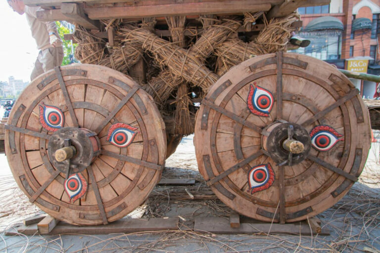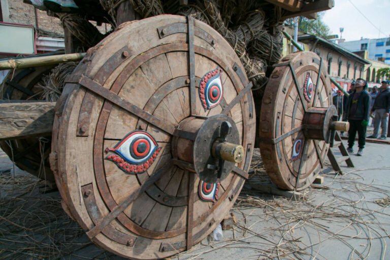 ती पाङ्ग्राहरूलाई भैरवको प्रतीक मानिन्छ, जसले रथ यात्राका क्रममा कुनै अवरोध नआओस् भन्ने विश्वास व्यक्त गर्दछ । तस्बिरमा देखिएका चहकिला रातो र नीलो रङका आकृतिहरूले रथलाई जीवन्त बनाएका छन् ।