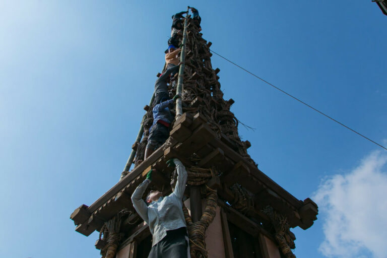 कालिगढहरू कुनै सुरक्षा उपकरण बिना नै रथको माथिल्लो भागसम्म पुगेर डोरी (लठ्ठा) ले काठहरू बाँधिरहेका दृश्यहरू निकै लोभलाग्दा र शाहसिक देखिन्छन् ।
