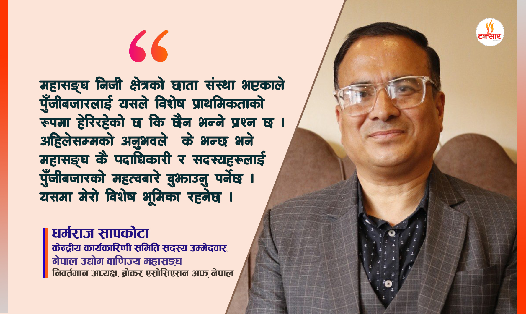 धर्मराज सापकोटा,ब्रोकर एसोसिएसन अफ् नेपालका निवर्तमान अध्यक्ष हुन् । उनी ३० वर्षदेखि पुँजीबजार,कर,लेखापरीक्षण,पर्यटन र कृषि क्षेत्रमा क्रियाशील छन् । उनी अहिले नेपाल उद्योग वाणिज्य महासङ्घको पुँजीबजार फोरमको सहसभापति पनि हुन् । सापकाेटा नेपाल महासङ्घको आगामी नयाँ नेतृत्व चयनका लागि कार्यकारिणी समिति सदस्यको उम्मेदवार छन् । सापकोटाले १० वर्षदेखि महासङ्घसँग जोडिएर विभिन्न भूमिका निर्वाह गरिरहेका छन् । महासङ्घमा उहाँको उम्मेदवारी र एजेन्डबारे टक्सार न्युजले गरेको कुराकानी :