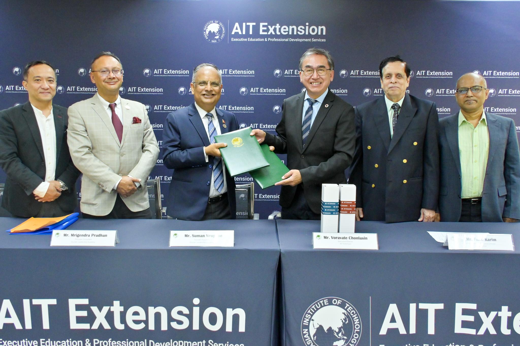 काठमाडौँ । थाइल्याण्डस्थित एशियन इन्स्टिच्युट अफ टेक्नोलोजी (एआईटी एक्सटेन्सन ) र नेपालको ड्रकर लिडरसिप एकेडेमी (डीएलए) बीच नेपालको बैंकिङ तथा कर्पोरेट क्षेत्रमा नेतृत्व विकासका लागि रणनीतिक साझेदारी भएको छ। एआईटीको कार्यकारी शिक्षा इकाई ‘एआईटी एक्स्टेन्सन’ र डीएलएबीच हालै यससम्बन्धी समझदारी पत्रमा हस्ताक्षर भएको हो।