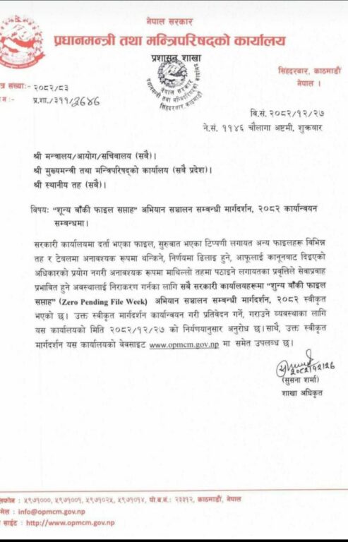 सरकारी कार्यालयमा भएका फाइलहरू विभिन्न तह र तेबलमा अनावश्यक रुपमा थन्किने, निर्णयमा ढिलाई हुने, आफूलाई कानुनबाट दिएको अधिकारी प्रयोग नगरी अनावश्यक रुपमा माथिल्लो तहमामा पठाउने लगायतको प्रवृत्तिले सेवाप्रवाह प्रभावित भएको भन्दै यसलाई रोक्न शुन्य बाँकी फाइल सप्ताह अभियान सञ्चालन मार्गदर्शन स्वीकृत गरेर कार्यान्वयनको परिपत्र गरिएको प्रधानमन्त्री तथा मन्त्रिपरिषद्को कार्यालयले जनाएको छ ।