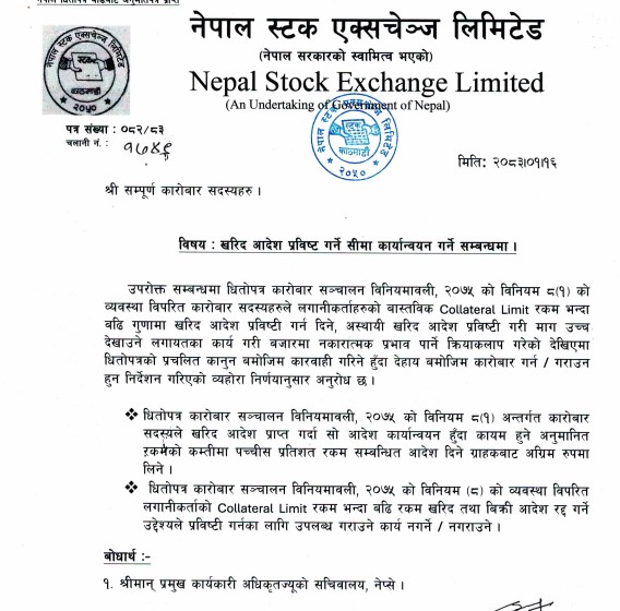 नेप्सेले धितोपत्र कारोबार सञ्चालन विनियमावली, २०७५ को विनियम ८(१) मा रहेको खरिद आदेश प्रविष्ट गर्ने सीमा कार्यान्वयन गर्न भन्दै ब्रोकरहरूका लागि कडा निर्देशन जारी गरेको हो।